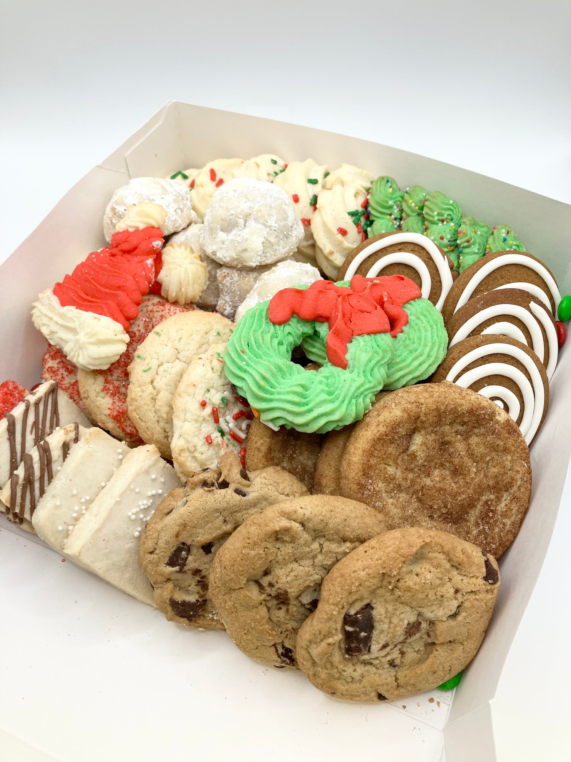 The box contains Butter cookies, Snickerdoodles, Classic sugar cookies with sprinkles, traditional gingerbread cookies , Wedding cookies ( Snowballs) , Chocolate Chunk cookies and traditional Shortbread!