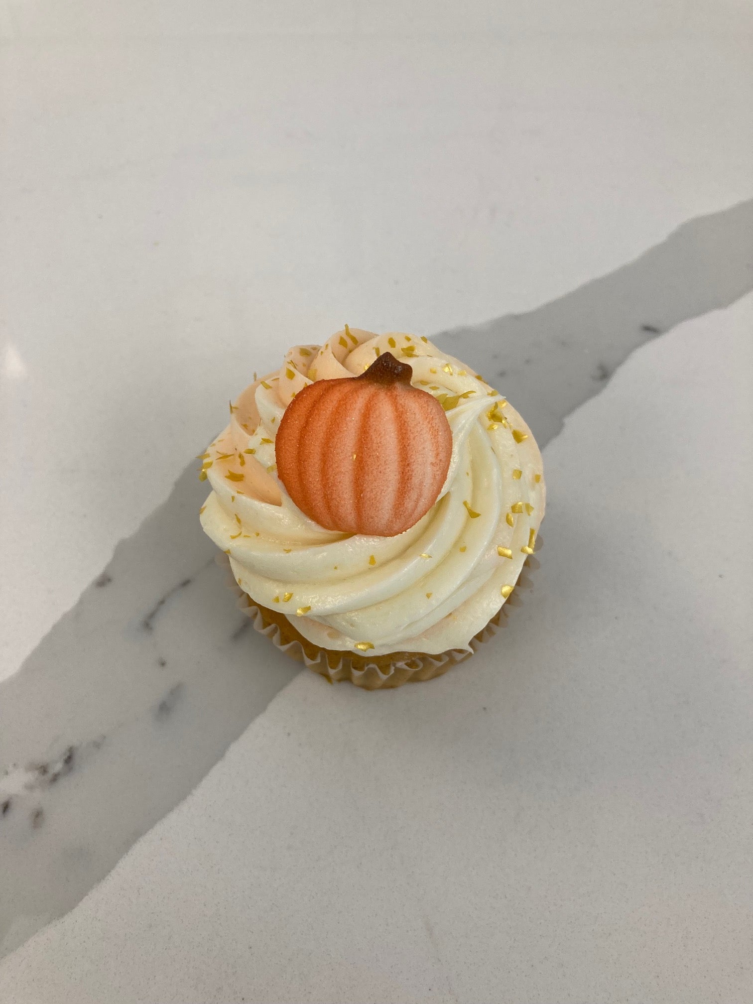 Pumpkin Cupcake, Swirled with cream cheese frosting and pumpkin spice buttercream.