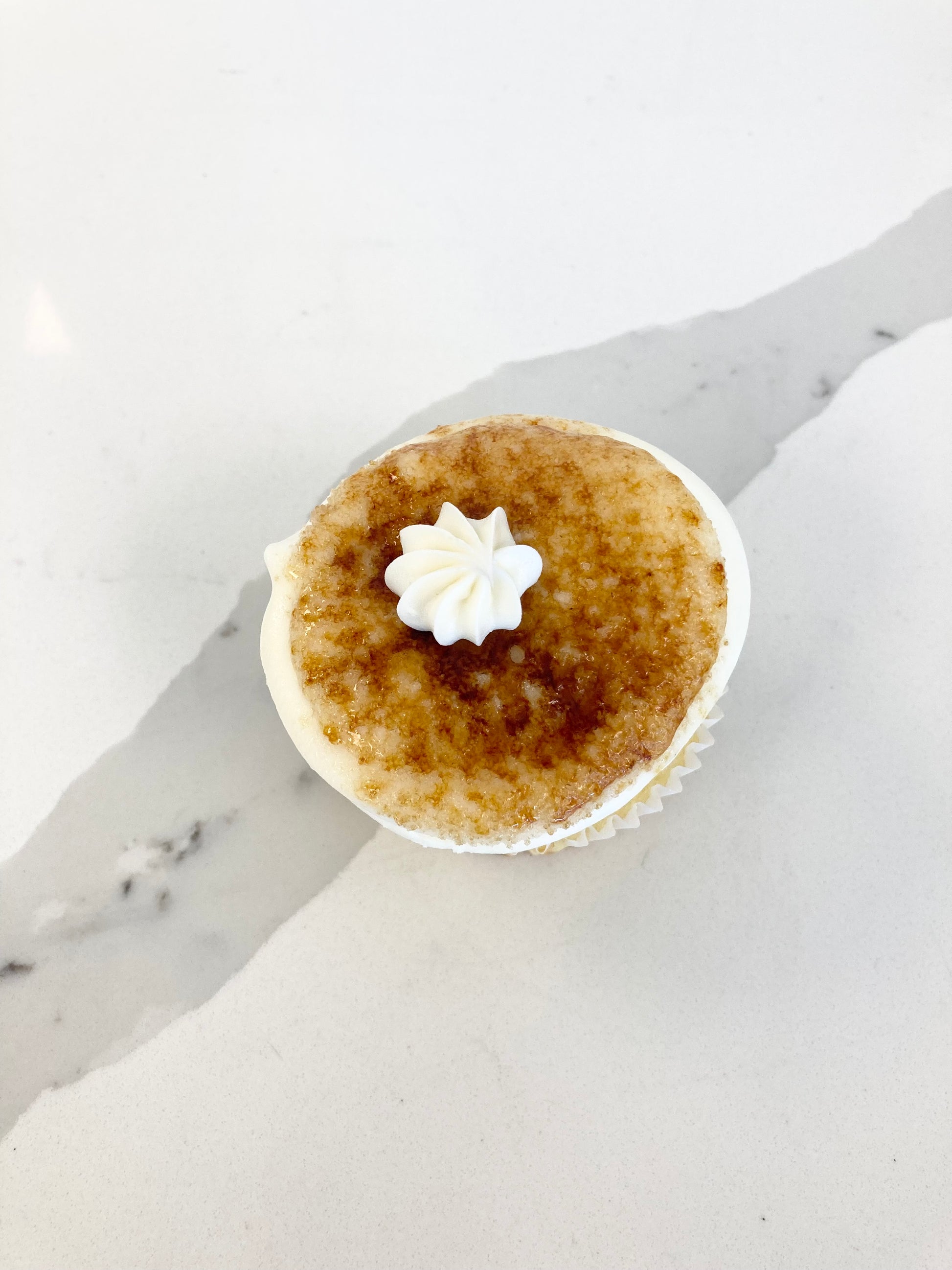 Vaniila cupcake, Swirled with buttercream and filled with a vanilla bean creme brulee custard. Toped with totasted sugar.